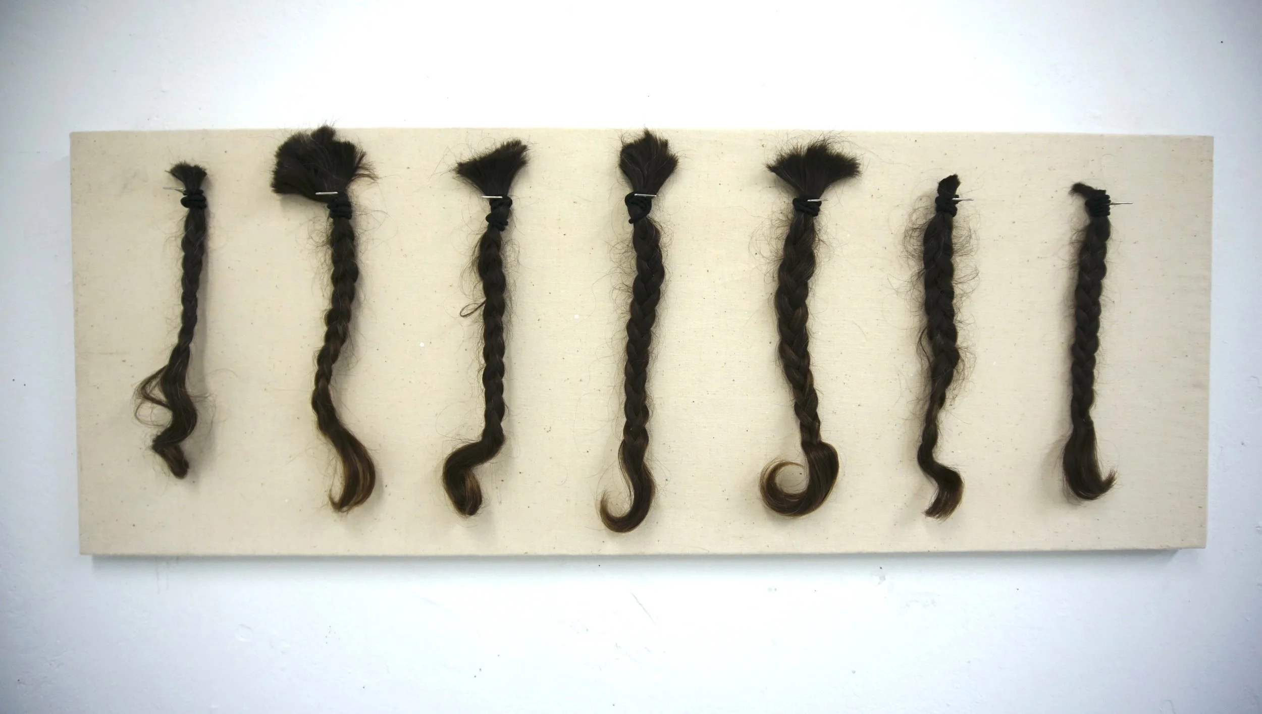7 braids, artist’s hair, t-pins, linen-wrapped plywood board, 2023-25