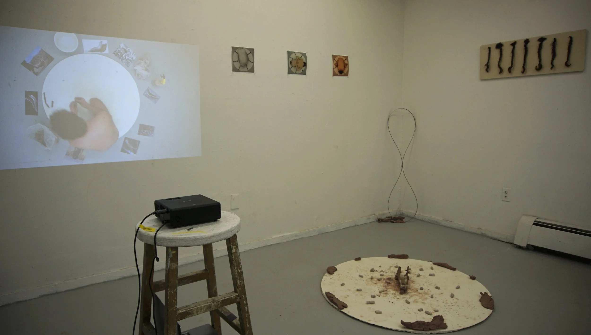 Accumulation of various attempts at molding a donkey’s jawbone out of clay with broken pieces around the perimeter of the circle with a final attempt in the center and teeth scattered around.